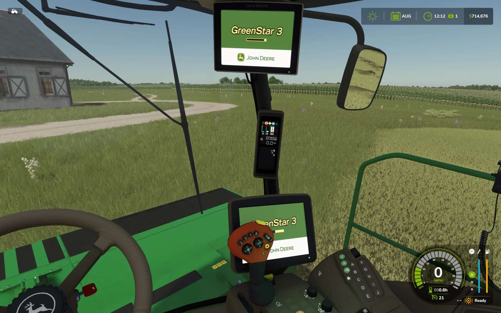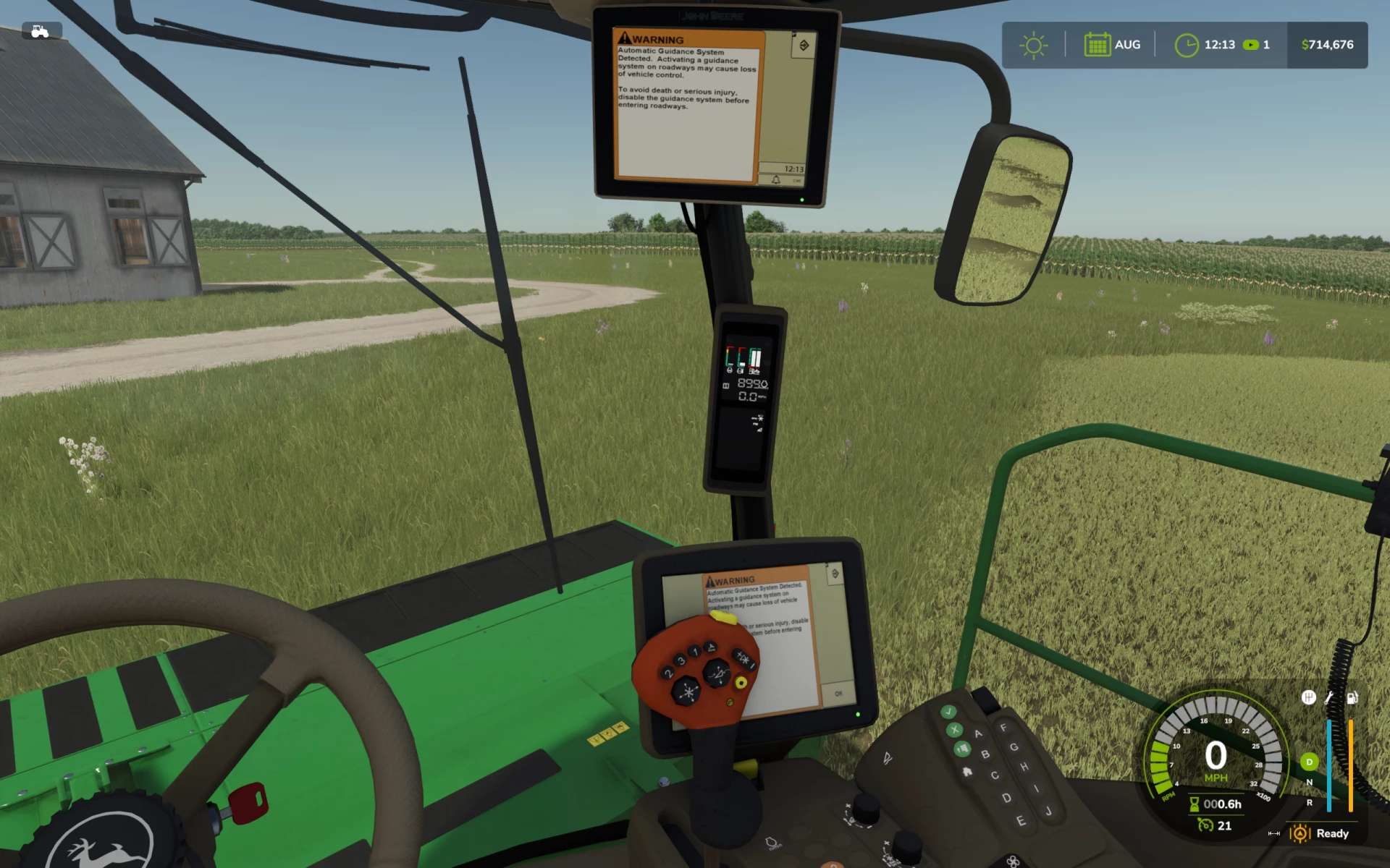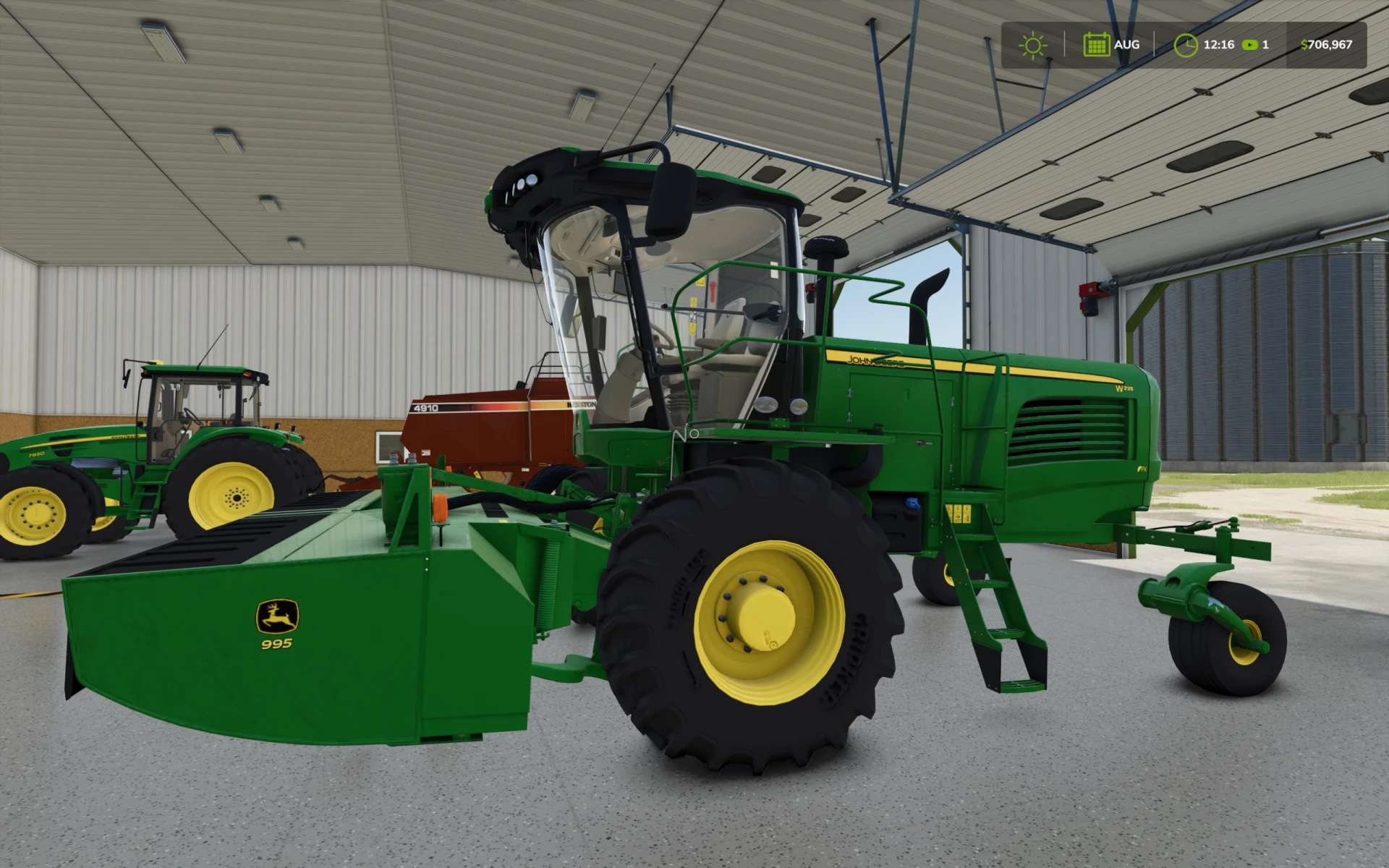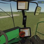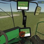 Accurate lighting internal and external with animated knob and LED indicators on CommandArm. 16 foot 995 rotary cutter bar (this was the precursor to the newer R500) with “windbent” custom tarp, updated hazard lighting, V-10 steel conditioning rollers, anti-slip strips, and an accurate drive motor. Accurate work lights forward and rear. Accurate cab details such as mirrors, cowls, rear tinted window, new diesel and DEF caps, new exhaust pipe, work platform, and steps. Inside the cab, you’ll find displays that indicate, changing gear indications (1 and 2), working engine speed buttons, engine hours, gal/hr, and power consumption. You’ll find an animated header engage switch as well as an animated turn signal/high beam knob. With the GreenStar 3 CommandDisplay and 2630 you can enjoy realistic startup screens and warning screens that clear as you move the swather either forward or in reverse.