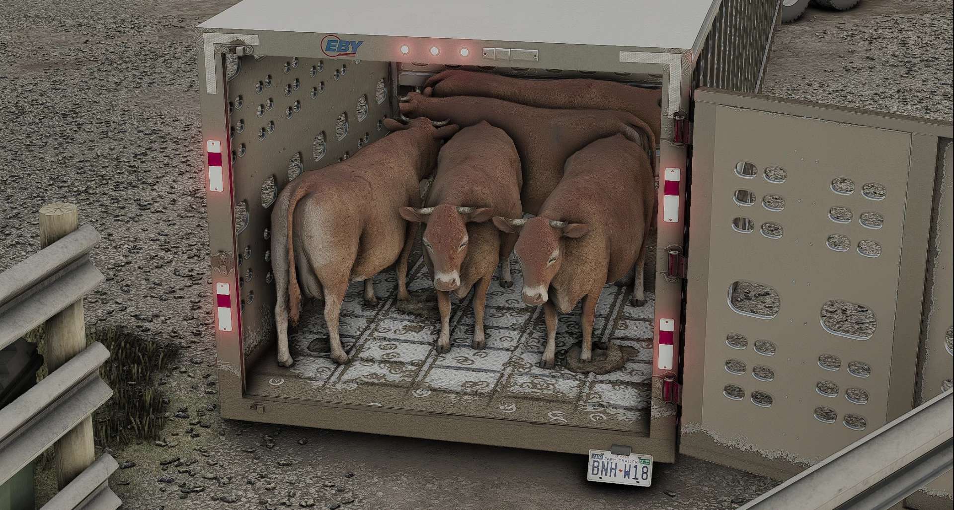 The most realistic cattle trailer in Farming Simulator TO DATE and I genuinely mean this. Nobody on the market can even come close to competing. The trailer has custom dirt maps. All the hinges/gates/handles have their own separate animations. MULTIPLE porchlight options (may have gone overboard). Realistic “farm use” trailer plates….for the tax exemption (if you know you know.) Chicken lights and accurate decals to equip the trailer. The animals do show up inside as well. (even the baby animals)