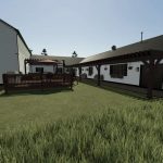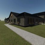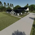 This is a Farmhouse used for RP, sleeping and changing clothes. The garage can be used for vehicle and/or equipment storage. This house is comprised of 3 bedrooms, 3 bathrooms, Kitchen/Dining, Laundry, Living Room, Office, Game room, a comfortable back porch area and an attached 75×50 garage/shop. This version for FS25 has the original brick exterior of the house as well as the option of color-selectable siding.