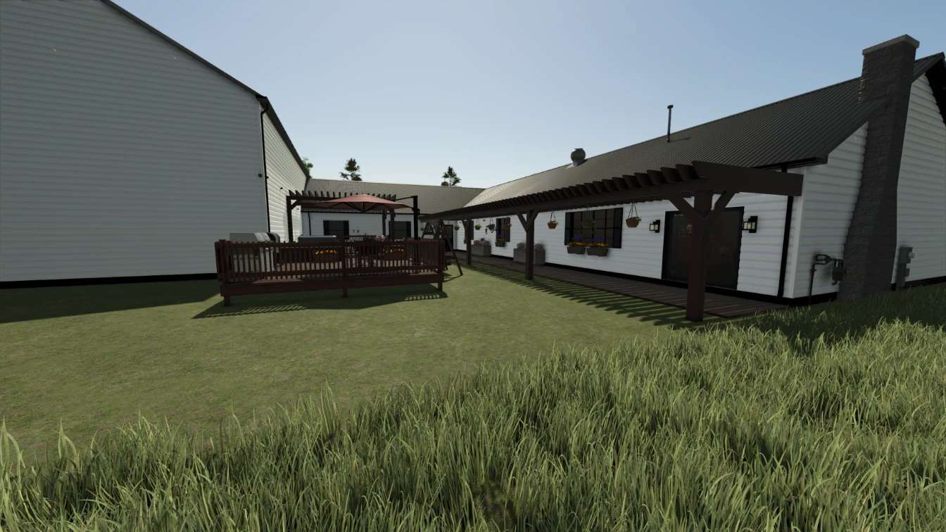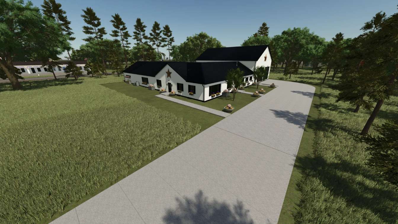 This is a Farmhouse used for RP, sleeping and changing clothes. The garage can be used for vehicle and/or equipment storage. This house is comprised of 3 bedrooms, 3 bathrooms, Kitchen/Dining, Laundry, Living Room, Office, Game room, a comfortable back porch area and an attached 75×50 garage/shop. This version for FS25 has the original brick exterior of the house as well as the option of color-selectable siding.