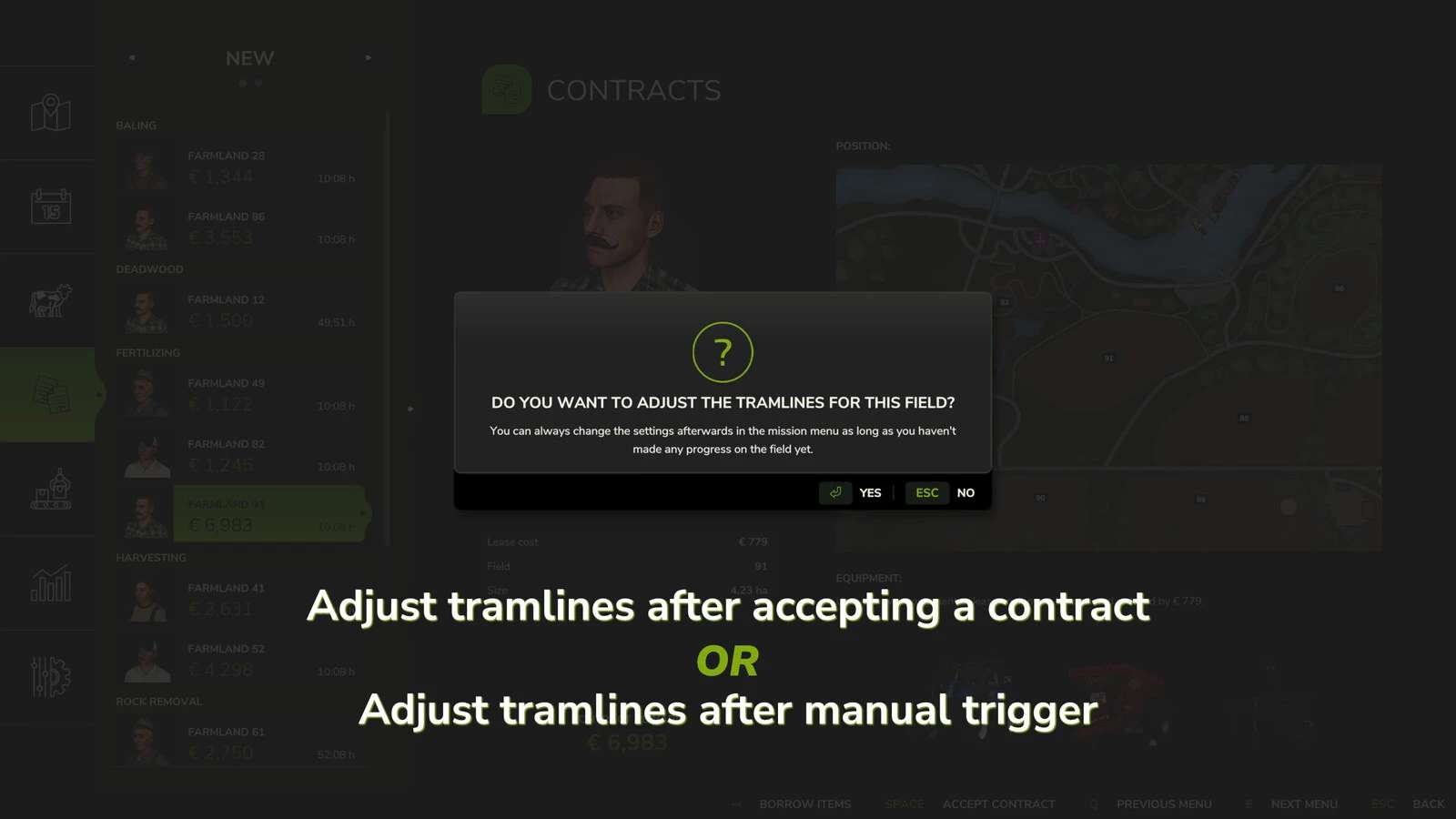 This mod allows you to adjust the tramlines on mission fields to match your own machines or working widths of rented mission vehicles.