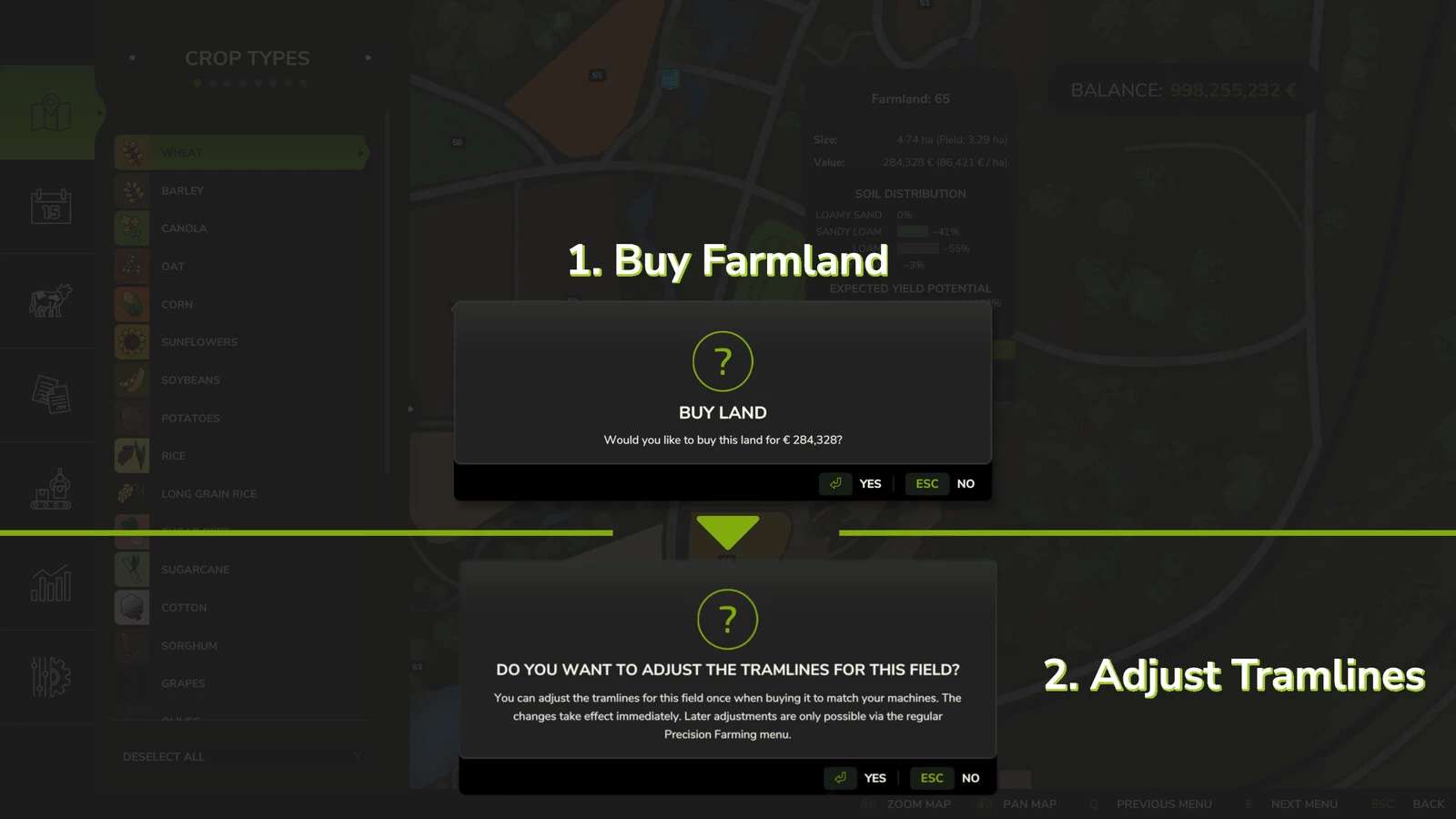 When accepting a field mission (fertilizing, spraying, hoeing, weeding) in the mission menu, an additional window appears for supported crop types that allows you to adjust the tramlines.
