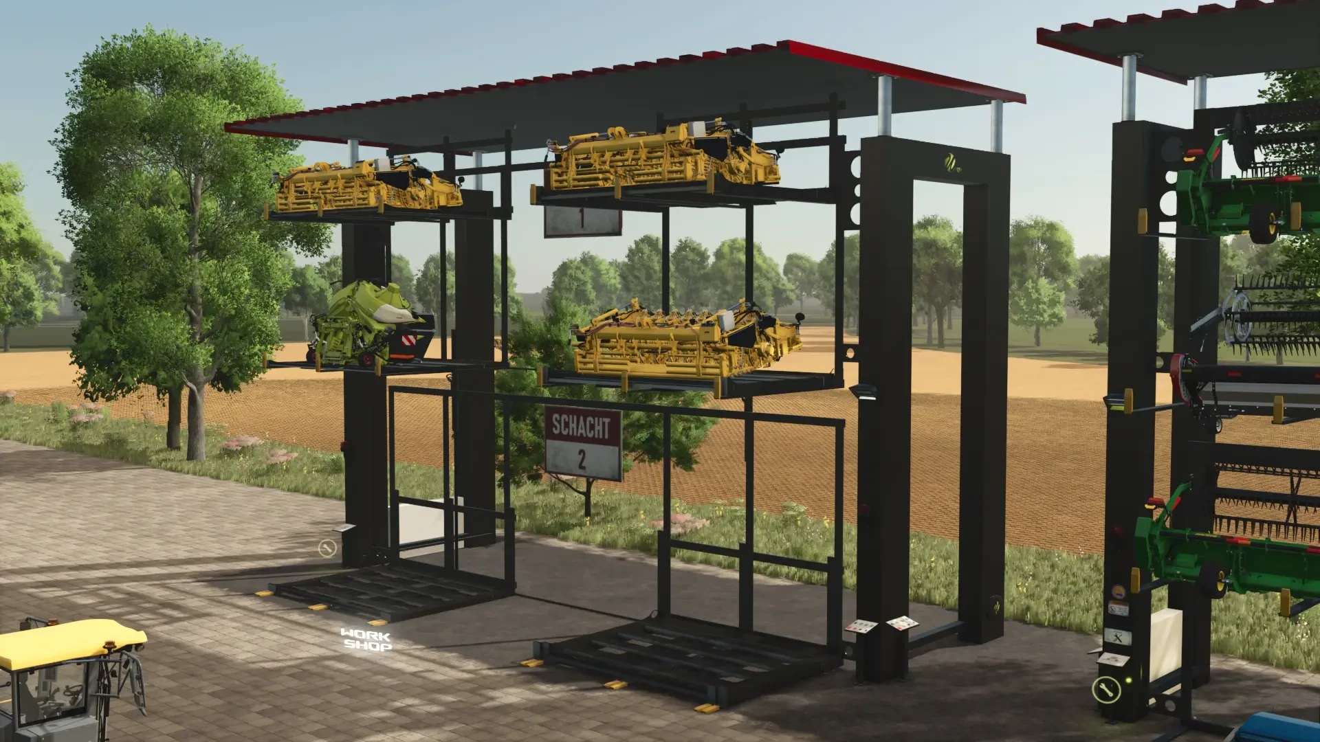 Built-in workshop for repairing and configuring the stored cutting units and! vehicles standing in front of the storage units!