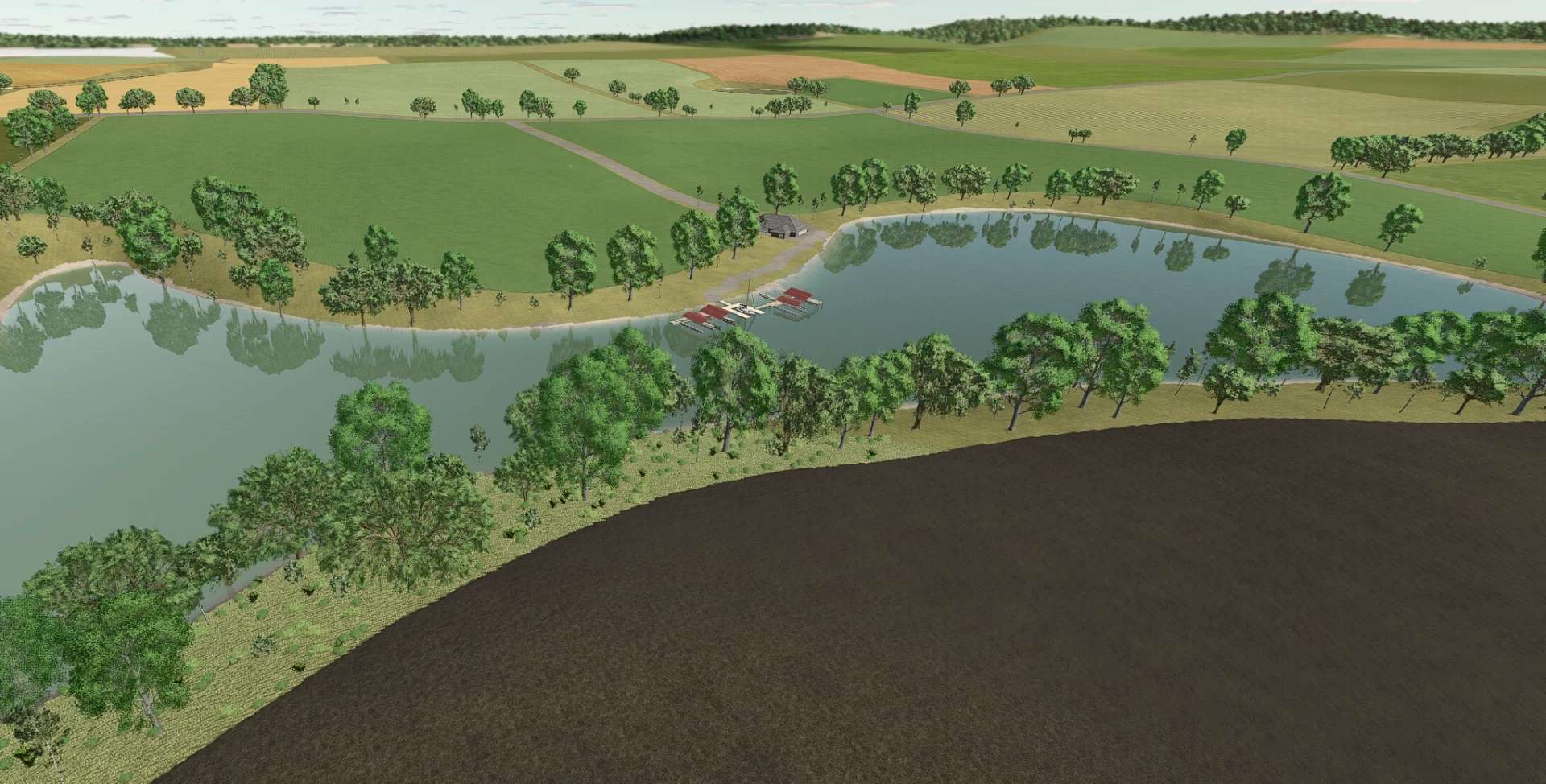 It has a small town area in the center of the map, with all of the sellpoints, and a shop. There is one, small, starting farm, as well as a bigger starting area for those that would like to create their own farm. The map has been designed with the intention of running on multiplayer servers, hence the smaller file size and simplicity.