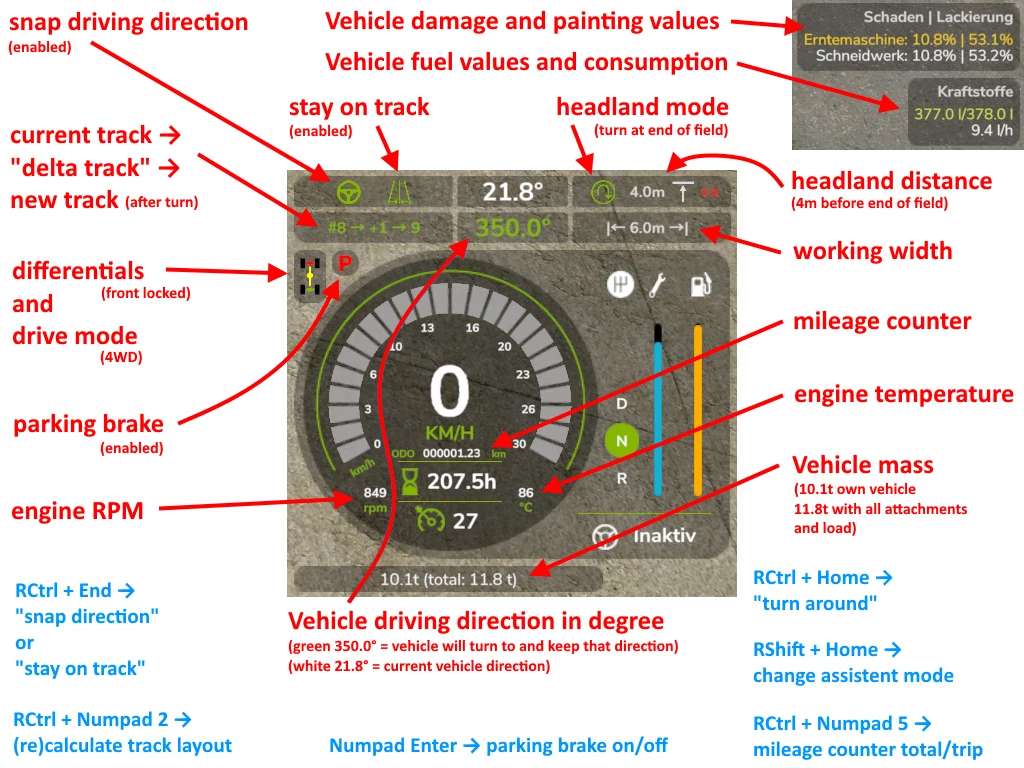 This is a modification for Farming Simulator 25. It adds a “track assistant” (“GPS”) and a “snap to driving direction” feature, a parking brake, differential locks, wheel drive modes and improved hydraulics controls to your vehicle. It also shows more vehicle details on the HUD including a odo/tripmeter.