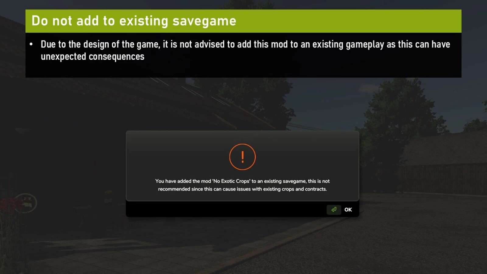 If you want to customize which crops are disabled, you can do so by editing the NoExoticCrops.lua file (line 15-22). The file is located in the mod’s zip file.