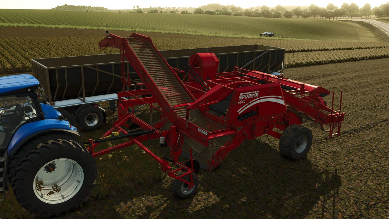 – Spudnik 6640 harvester, can harvest without the need to previously defoliate, simultaneously collects the potatoes piled up by the windrower, working width 4 to 5 rows (13ft / 4 meters), 1000 liters capacity, adjustable discharge belt, 270hp minimum recommended power.