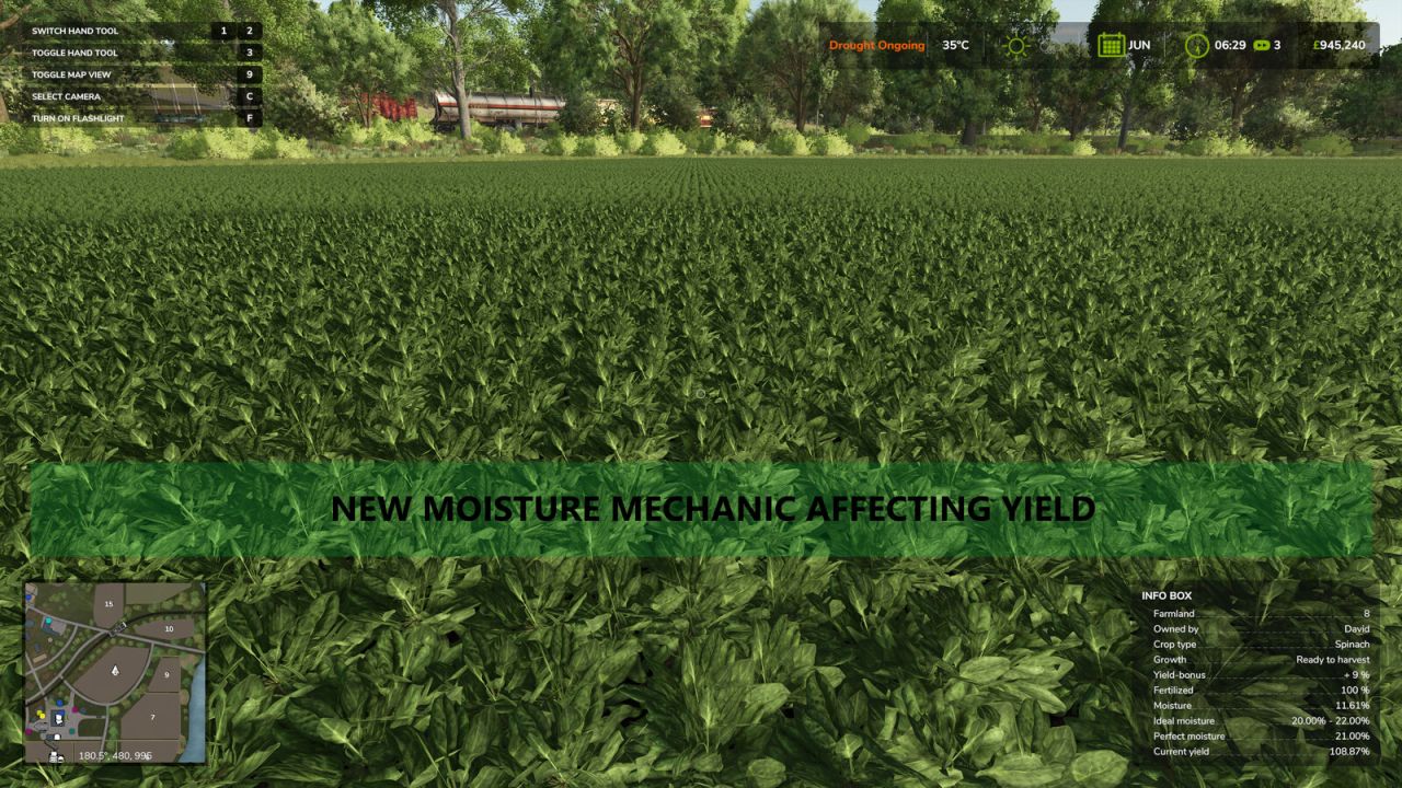 – Adds a moisture mechanic to fields; each type of crop has an ideal moisture range, being inside this range increases harvest yield