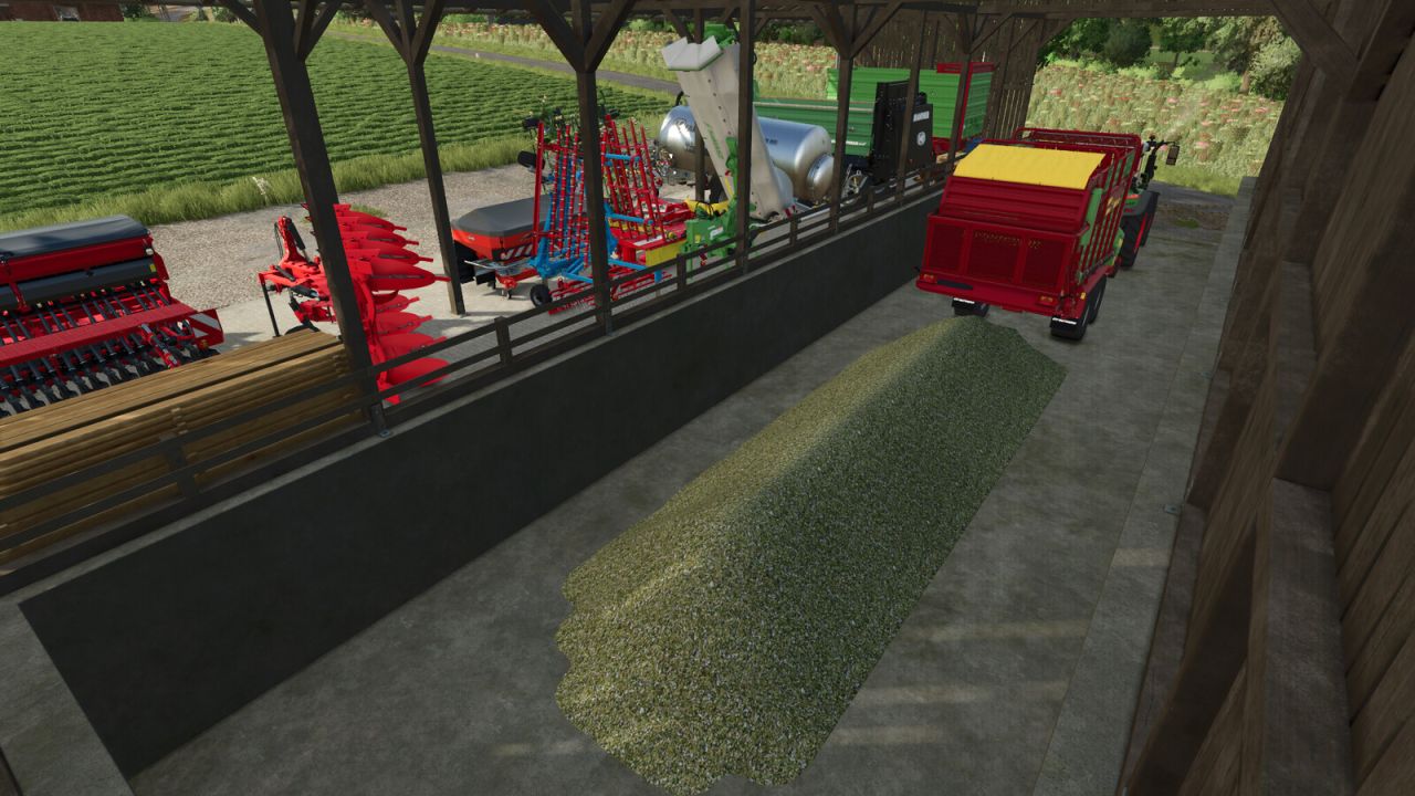 This building consists of a bunker silo and a slightly higher shelter for vehicles and machinery. The mod also includes a variant of the building where the actual bunker silo can be used as a wood chip storage.