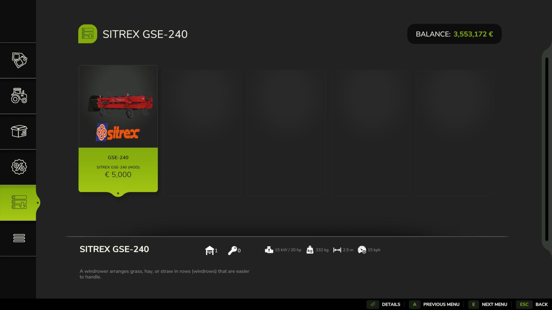 The Sitrex GSE‑240 is a belt-driven side-delivery hay rake, part of the robust GSE series designed for efficient and gentle hay windrow formation.