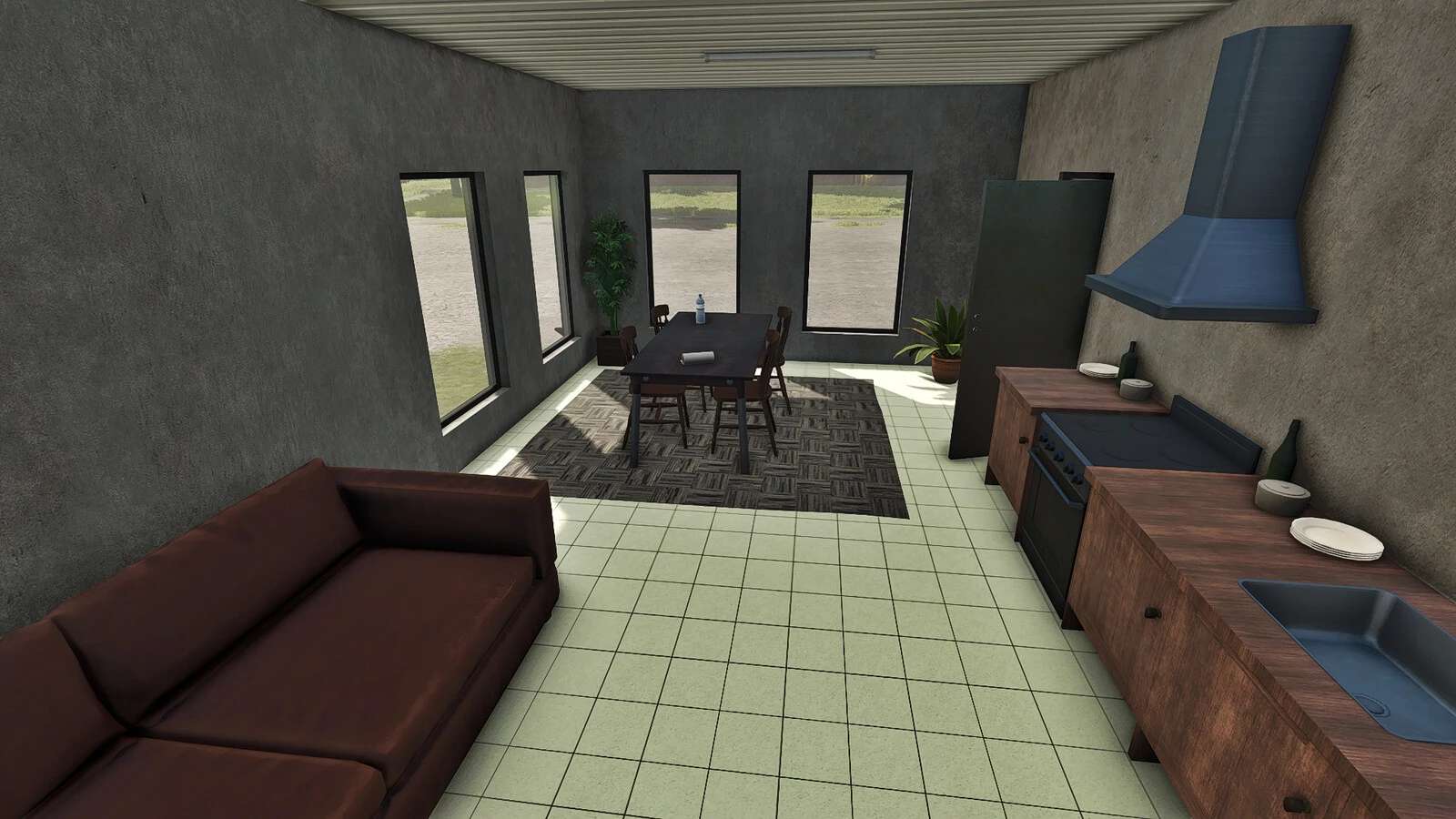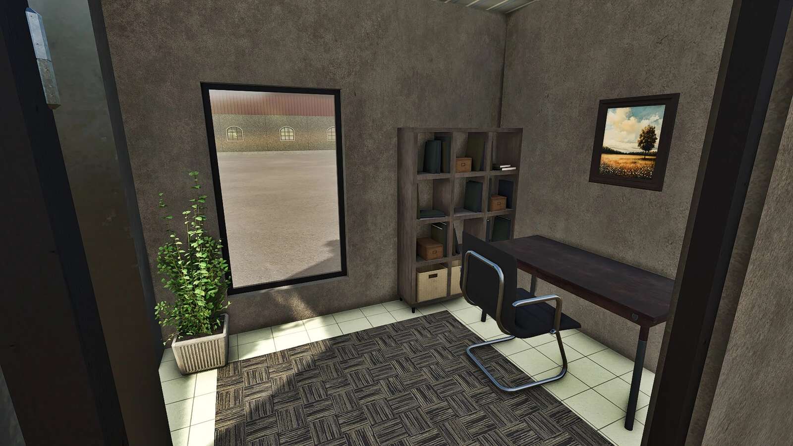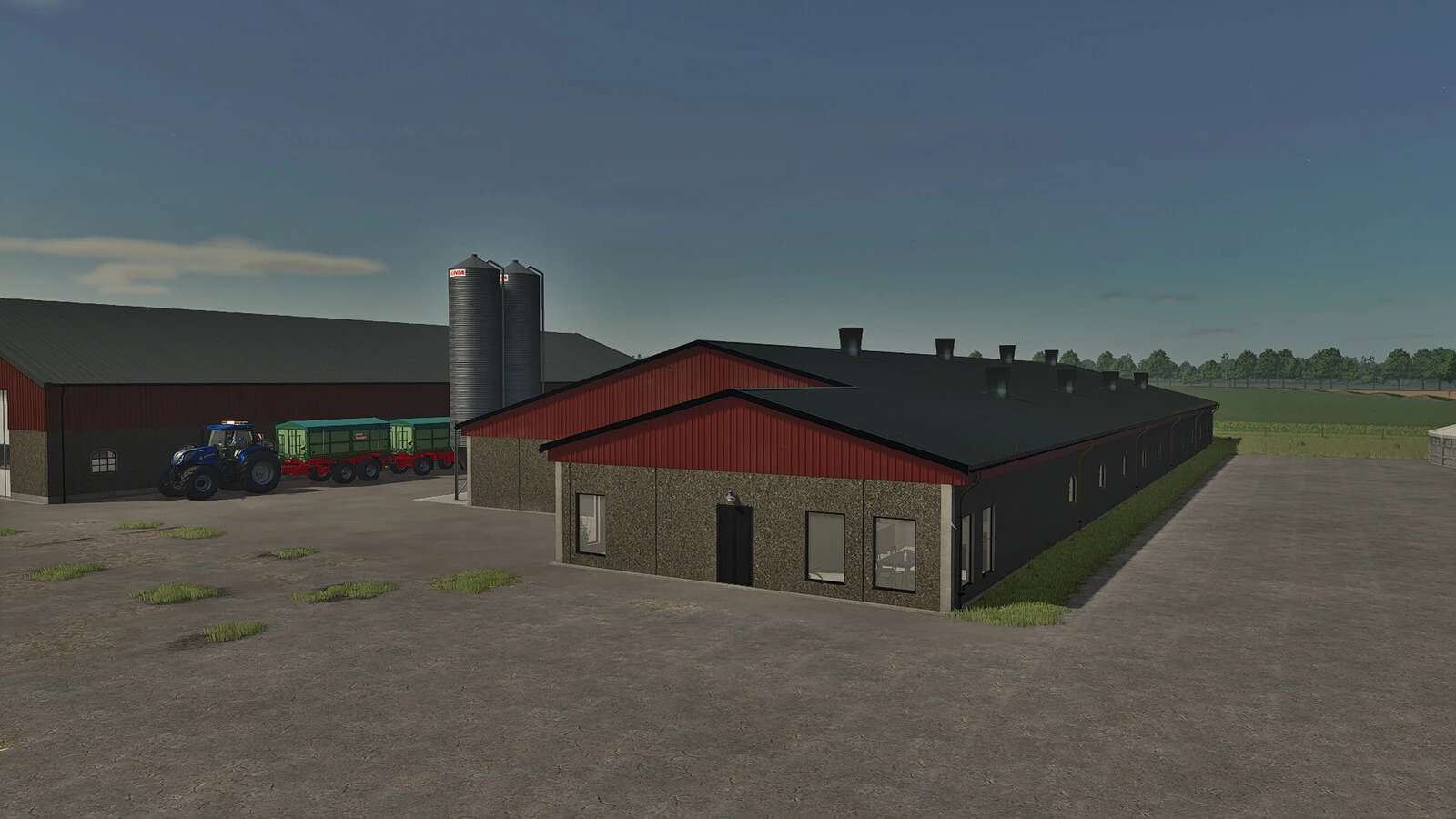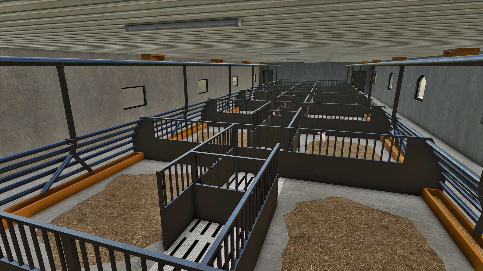 Swedish inspired pigshed with four sections and full interior for fattening pigs. The building also contains staff space, such as an office, changing room and a canteen.