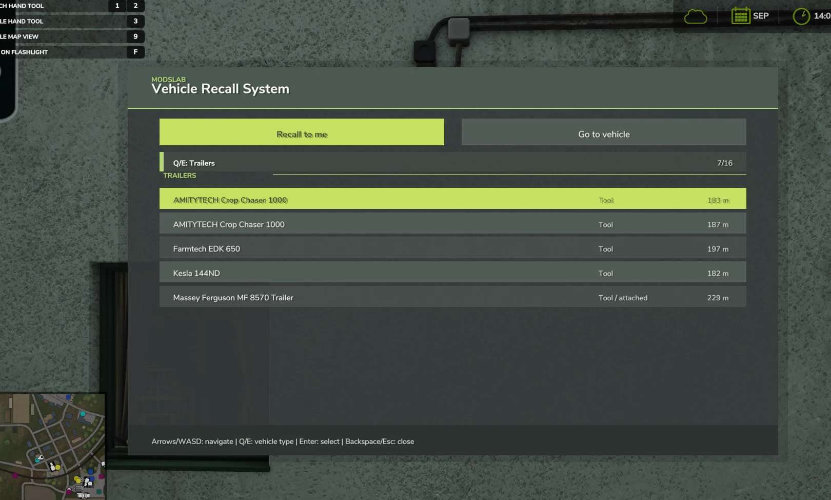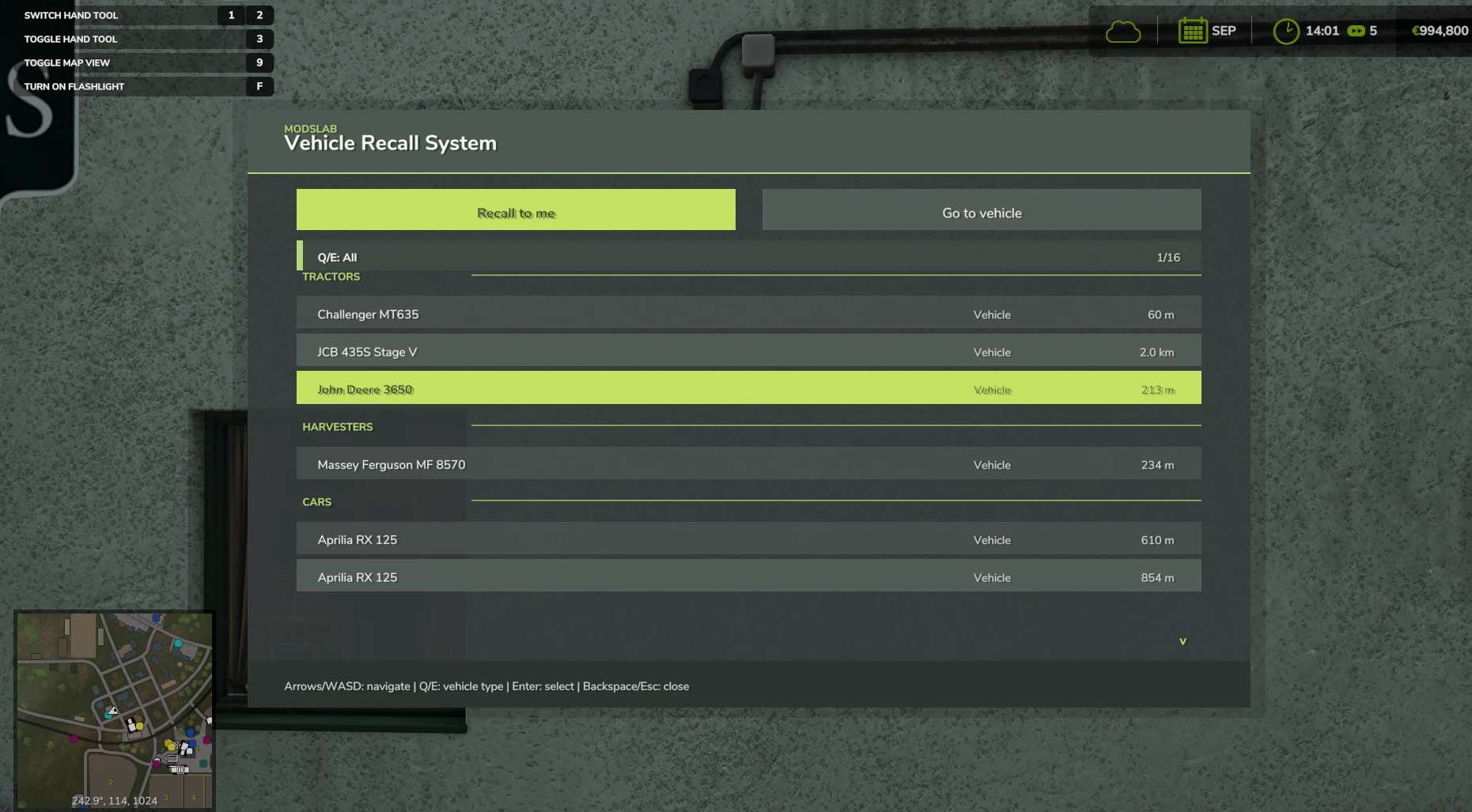 Vehicle Recall System is a Farming Simulator 25 script mod for quickly moving owned vehicles and tools. You can recall your vehicles to you or teleport your character to the selected vehicle.