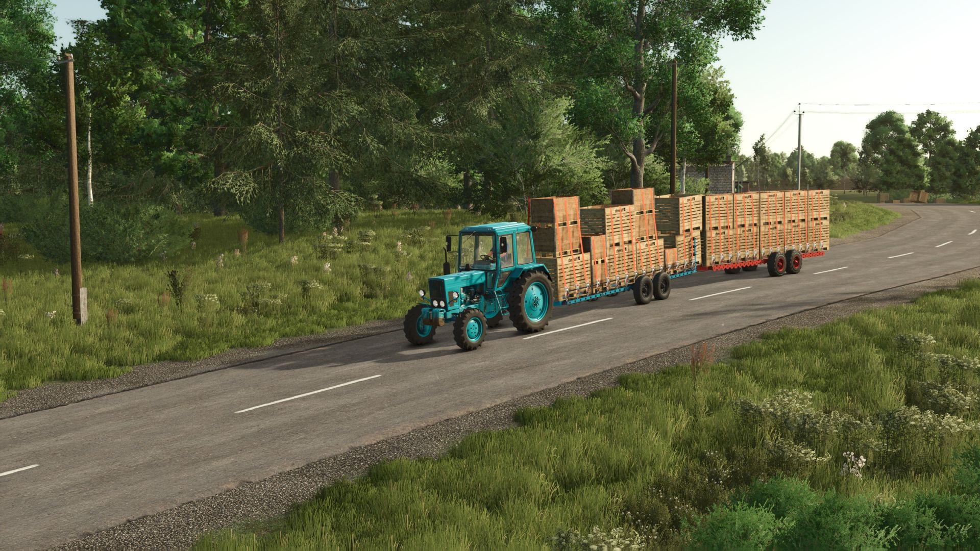 This machine is designed for loading fruit packed in containers, transporting them from between the rows of trees, and delivering them to storage and processing facilities for subsequent unloading.