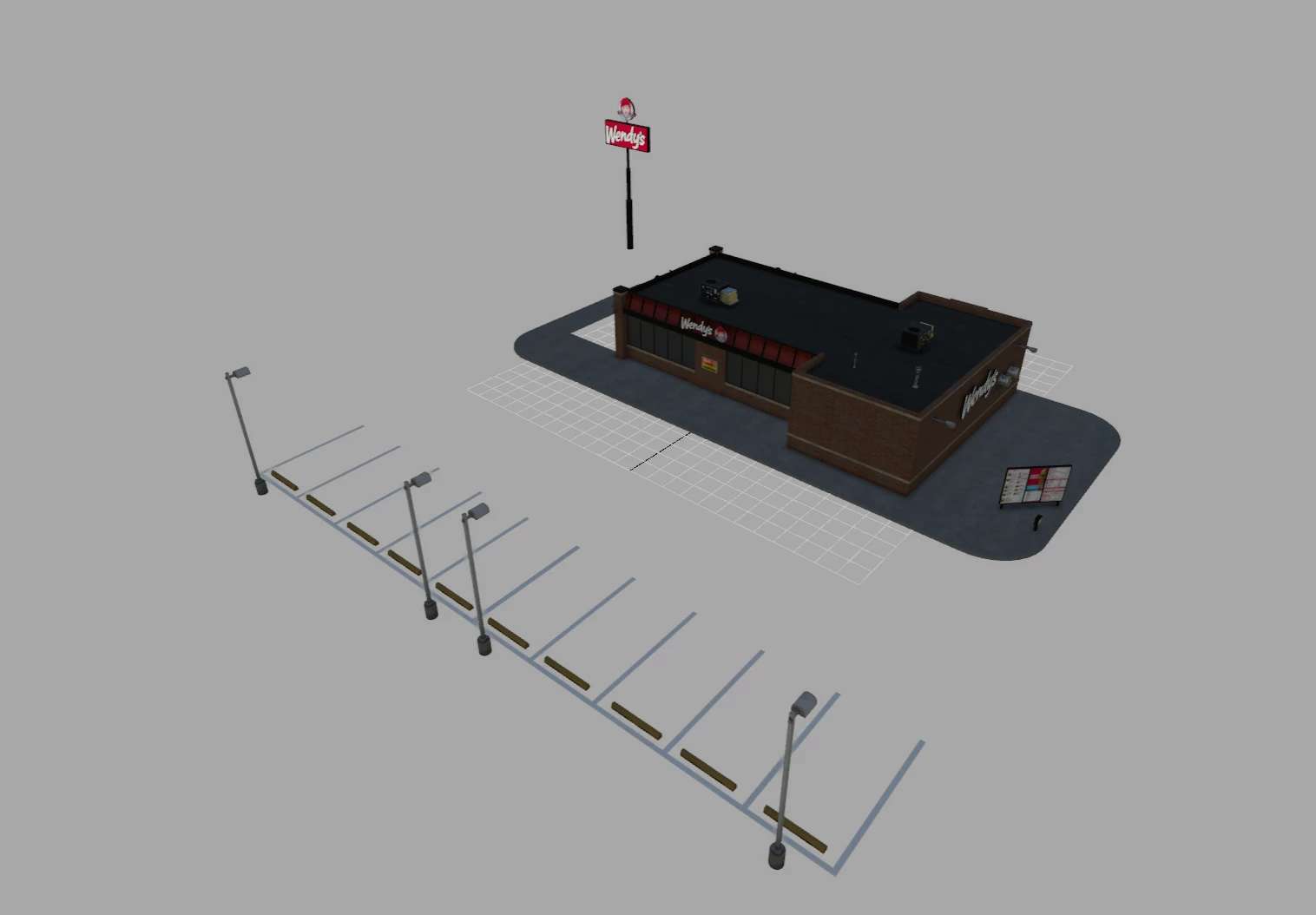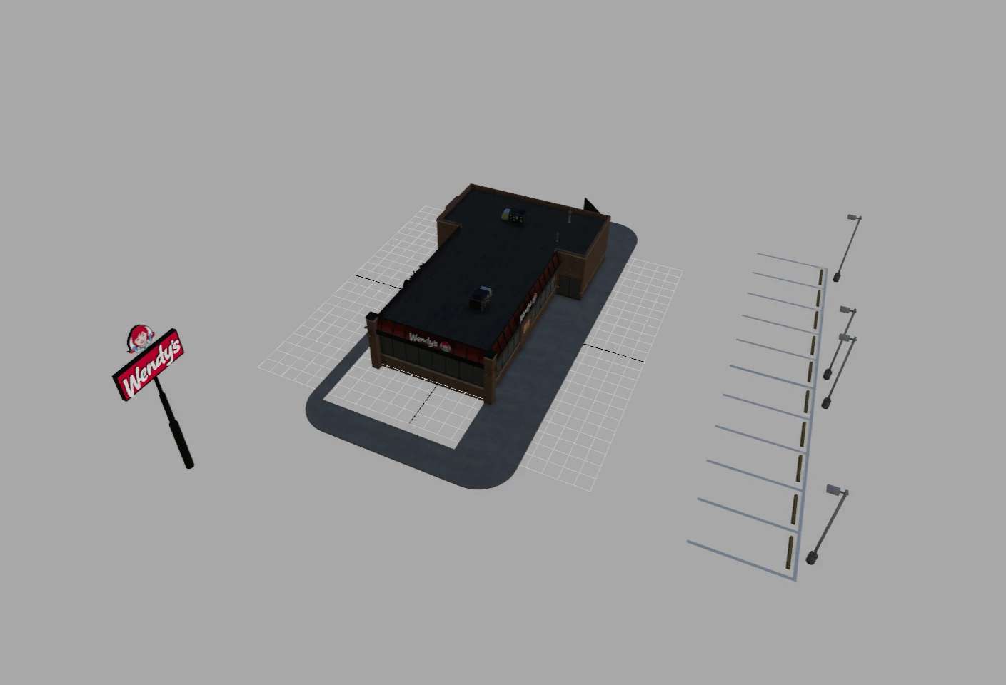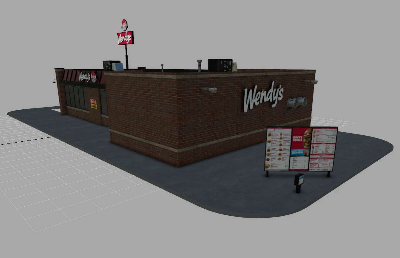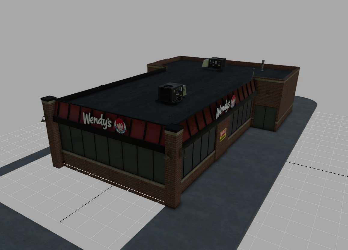 The LOD is set to 1200/1000/800 for various details. With snow shader and the signs will light up at night. You can set the Wendys’ sign to rotate if you wish.